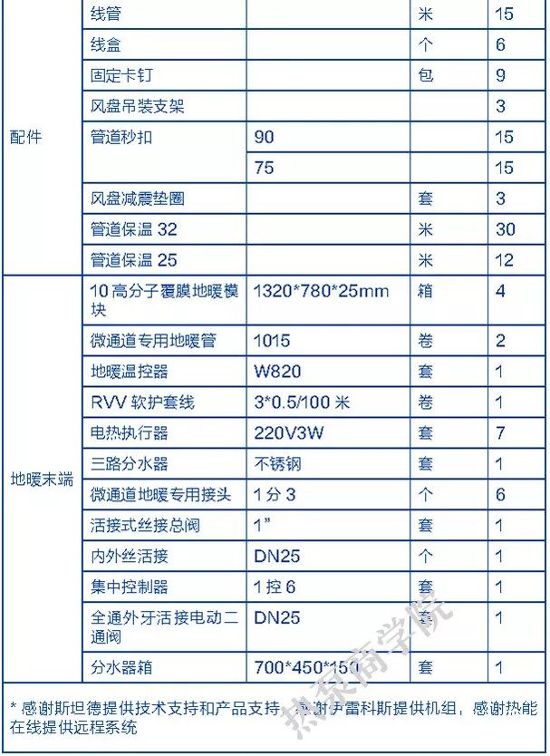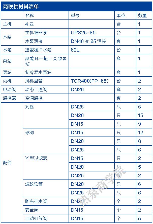 两联供在设计和安装上要求更高,也更容易犯错,稍有失误就会带来不可估量的损失。今天,我们就结合上面的系统图,来认识一下一套典型的空气源热泵两联供系统的材料清单。